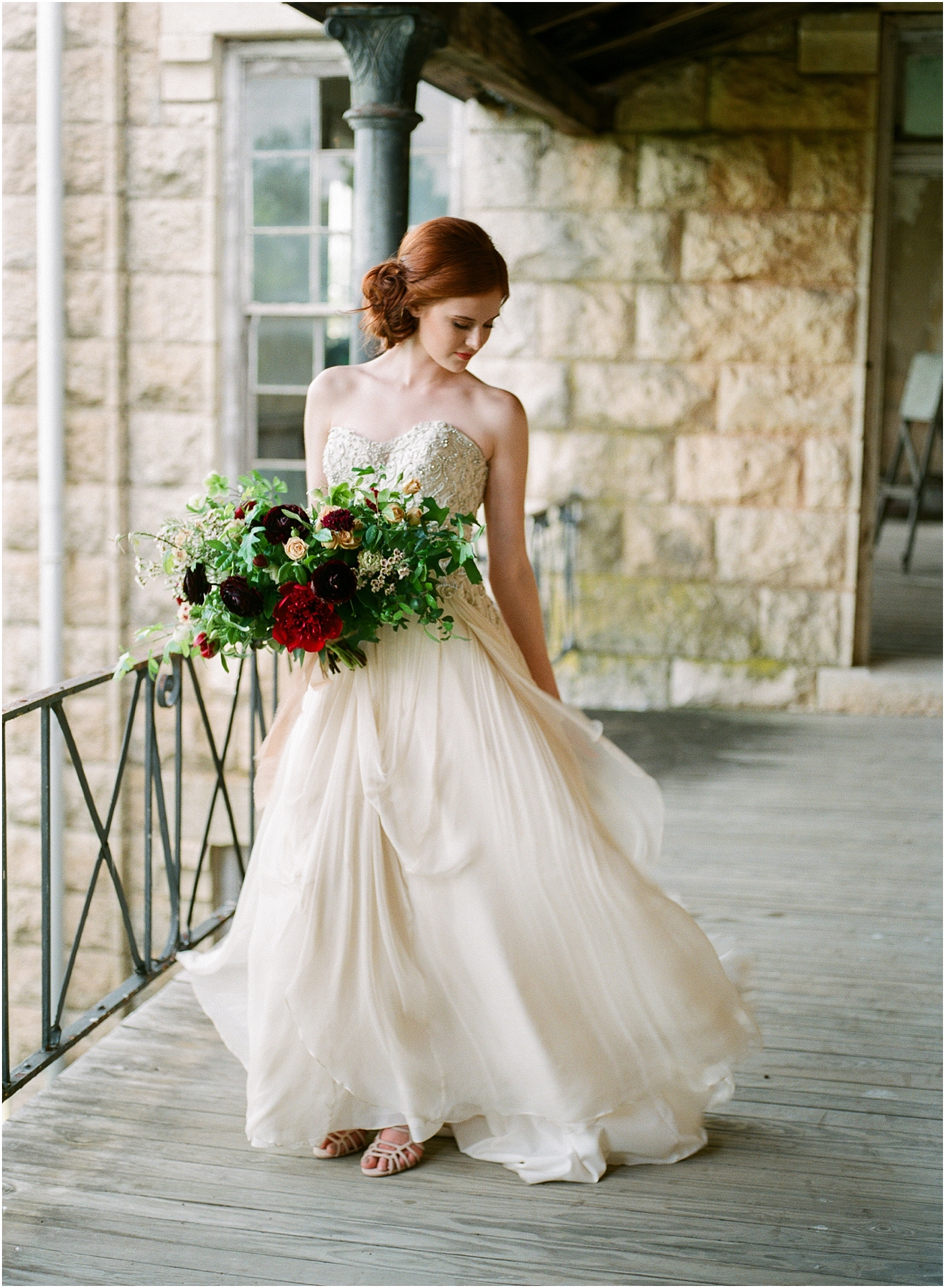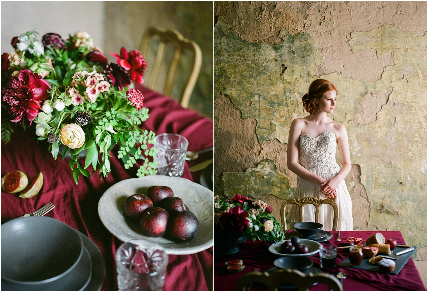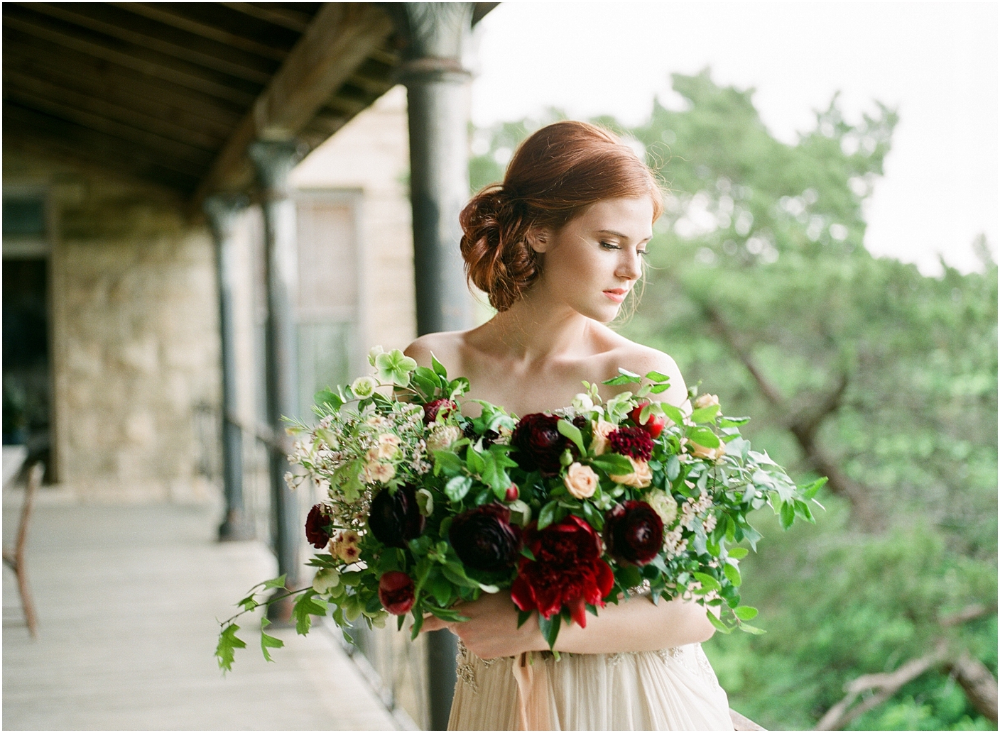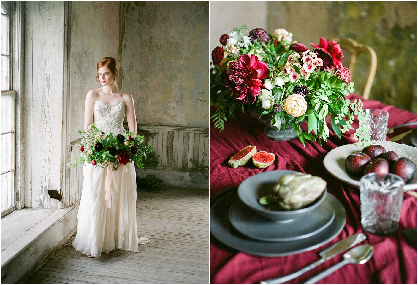 I am thrilled to see this shoot featured on 100 layer cake! Here in the Dallas/Fort Worth area, we have an amazing community of film photographers we’ve named the “Haystack Film Community“. Together we collaborate with a team of incredible vendors with a fine art vision and do shoots on the regular. For this shoot, we went with a moody burgundy look. We shot at the Trinity Institute which is a beautifully overgrown and worn down building in Tehuacana.