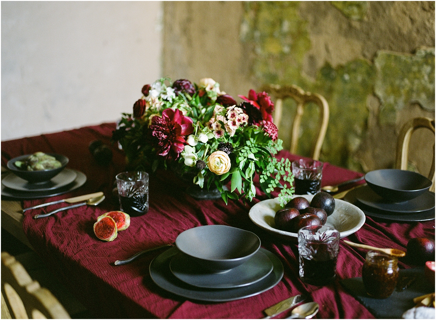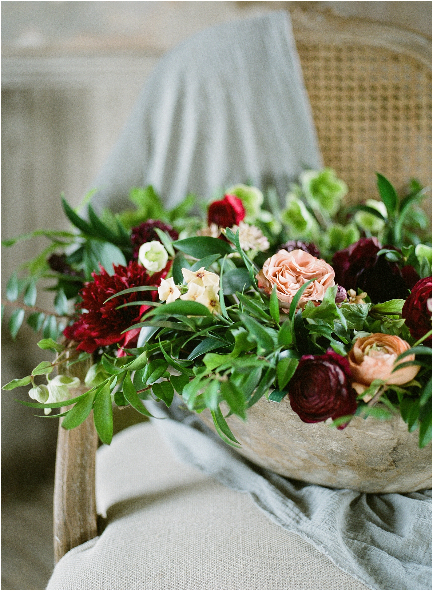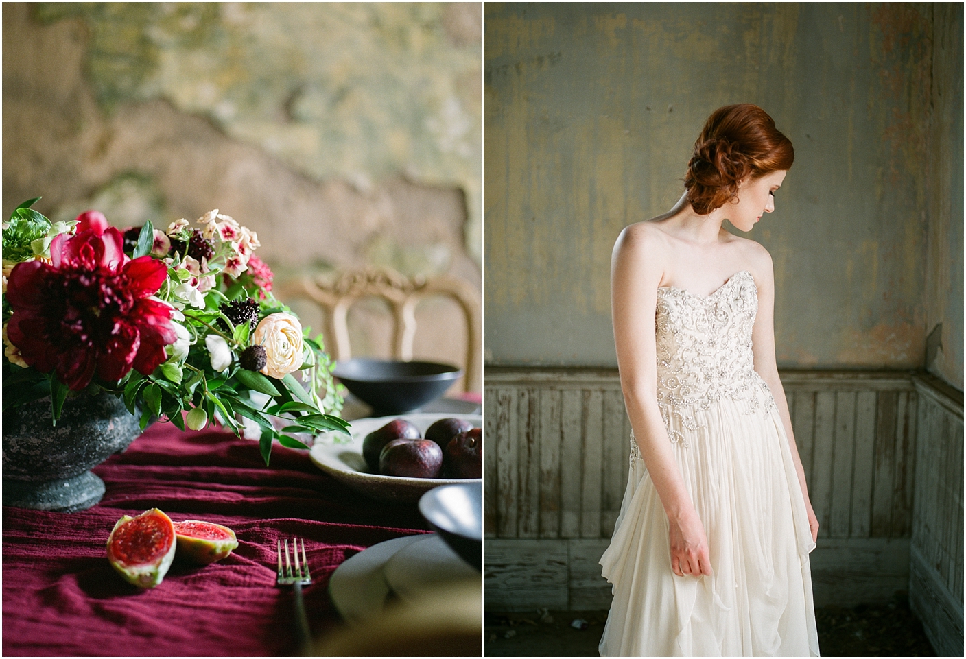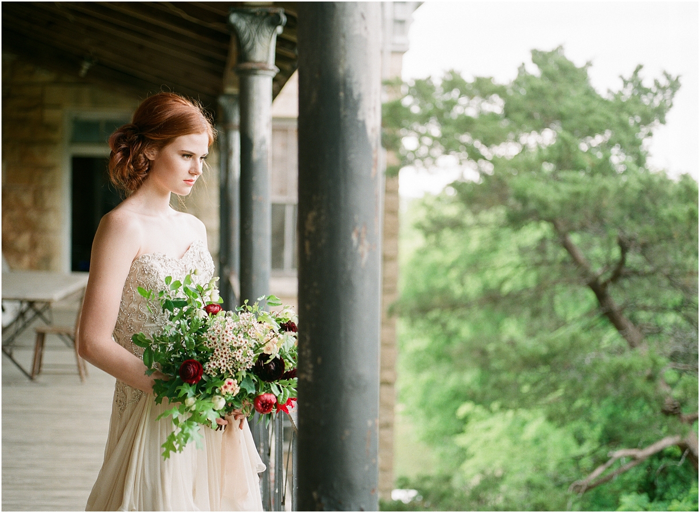 I am thrilled to see this shoot featured on 100 layer cake! Here in the Dallas/Fort Worth area, we have an amazing community of film photographers we’ve named the “Haystack Film Community“. Together we collaborate with a team of incredible vendors with a fine art vision and do shoots on the regular. For this shoot, we went with a moody burgundy look. We shot at the Trinity Institute which is a beautifully overgrown and worn down building in Tehuacana.